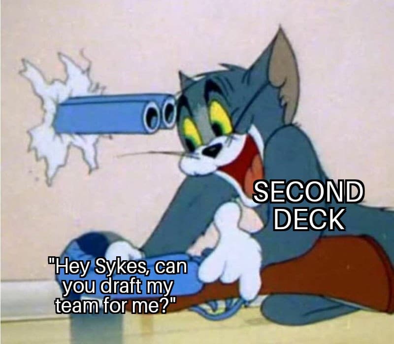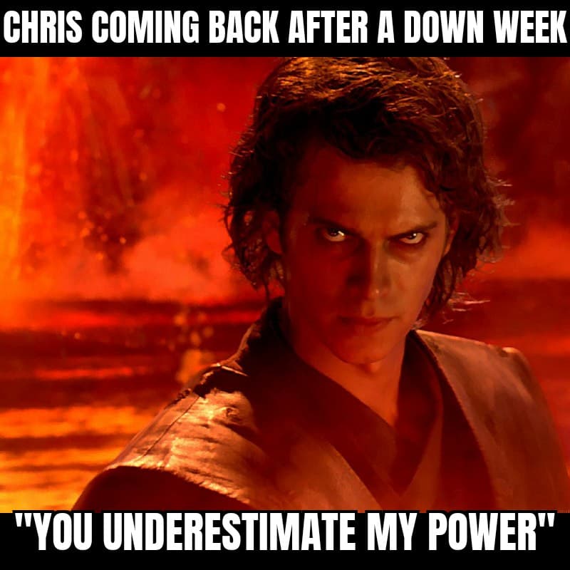In what projects to be the lowest-scoring outing of the year, is the most Kaiser thing that could happen. QAnon has been devastated by injuries, and while Dak is done for the year, some of these other guys are gonna be back soon. And knowing what we know about Kaiser’s history in this league, he’s always been a late-season stunner. During his two championship runs, he had a combined regular-season record of 13-13. In 2012, he snuck into the old 8-Team format with a 6-7 record and then went on a run, knocking out Tim, Chris, and Jones to take his first title. Then in 2019, after going 7-6 in the regular season, he knocked off Trigger, Matt, and Kronner, again winning a title as the lowest seed in the tourney. If Kaiser can hold on here till his team gets healthy, he could sneak in again break some more hearts.