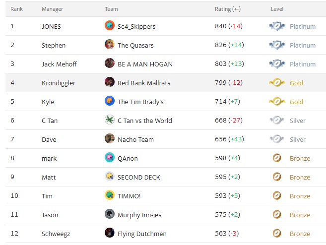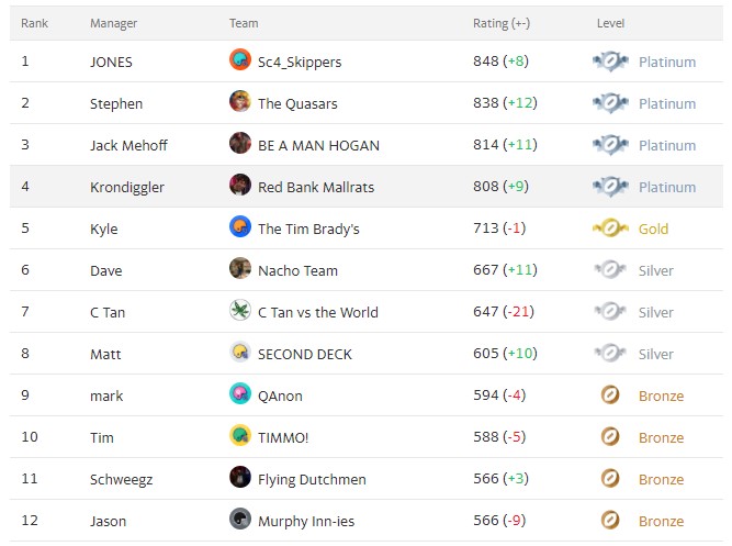 Kronner ping-ponged back into the PLATINUM Club with a Win over fellow GOLD manager Kyle. This leaves Kyle as the lone Golden Boy, and the SILVER Gang added Matt to their ranks. A week after 80% of the BRONZE managers won, 75% of the remaining teams lost.