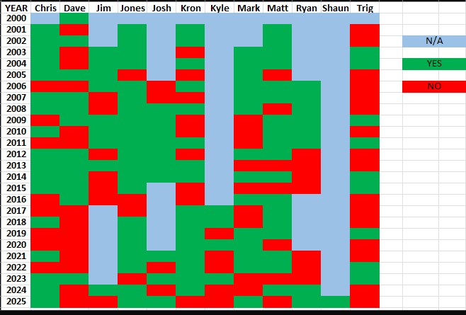 | Josh | 1-1 | 1-0 | N/A | 0-1 | 0-2 | N/A | 1-1 | 1-0 | N/A | N/A | 0-1 | 1-1 |